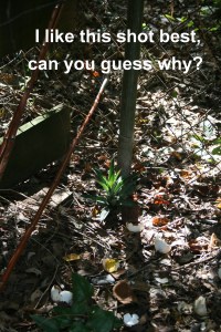 Life in a bin of decaying food scraps. Actually Jerry previously told me they were out there and today I went to see for myself. Not that I did not believe him, just wanted to see for myself, you know. And in truth there are four of them out there growing with no effort from us other than dumping into the bin the tops we whacked off four pineapples (at various times, not all at once) we brought home from our local food establishment.