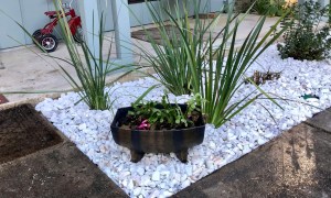 White stones spread in a garden spot and JT who worked so diligently to make it happen. Flowers on clearance and flowers to bloom in the Spring.