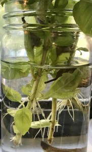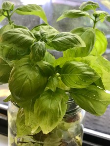 I harvested the last of my basil last week or possibly the week before, brought it into the kitchen, and deposited the few stems in a glass jar. Many years ago in a Friend’s kitchen, I admired her basil growing beautifully green and healthy in a glass.